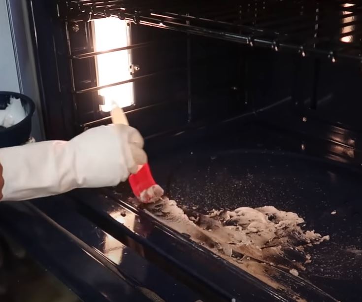 In your bowl, mix baking soda with water until it forms a paste, then spread it generously over the inside surfaces of your oven using the spatula.