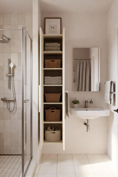 Make the most of vertical space to enhance both storage and style in a small bathroom. Install tall shelving units, wall-mounted cabinets, or open shelves that draw the eye upward and keep essentials off the floor. Hooks, vertical towel racks, and recessed niches can also add functionality without crowding the room. By thinking vertically, you free up valuable floor space while making the bathroom feel taller, more organized, and visually balanced.