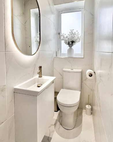Enhance the sense of space in a small bathroom by wrapping it in luminous white marble tiles. Their light-reflective finish brightens the room and creates an airy, open feel. Take the tiles from floor to ceiling and choose large-format options to reduce grout lines for a seamless look. A subtle herringbone pattern can further draw the eye upward and outward, visually expanding the space with timeless elegance.