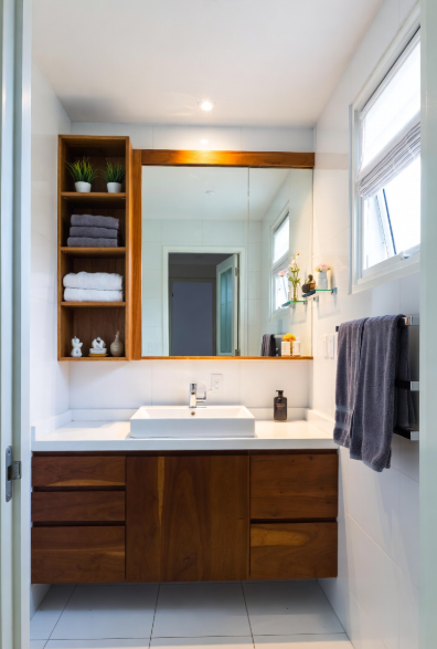 Make the most of limited space in a small bathroom by using a storage pod. When placed strategically, it can neatly store toiletries, towels, and other essentials, helping to reduce clutter while maintaining a clean, organized, and visually appealing bathroom.