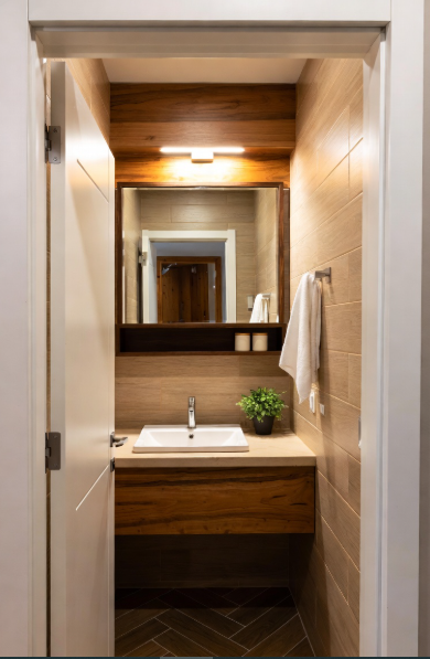 Transform a compact bathroom into a warm, inviting retreat by using wood-look tiles that deliver natural charm with everyday durability. Choose a rich, honey-toned porcelain that captures the warmth of real wood, and lay it in a herringbone pattern on the floor. Extending the tile partway up the walls creates a cozy, enveloping effect, making the small space feel intentionally intimate, refined, and luxurious.